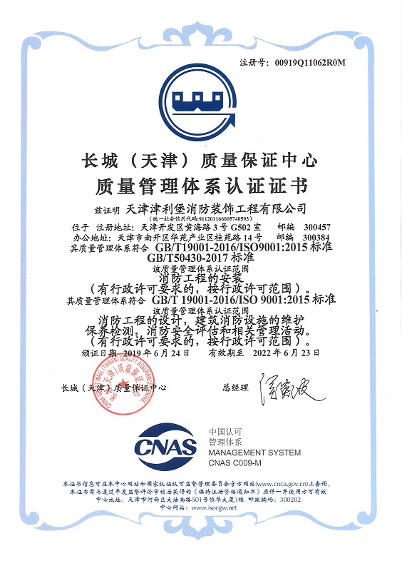 津利堡公司于2000年04月通過(guò)了適用于消防工程的設(shè)計(jì)、安裝及服務(wù)的質(zhì)量管理體系認(rèn)證(GB/T19001 idt ISO9001)。為適應(yīng)市場(chǎng)的發(fā)展,促進(jìn)公司在職業(yè)健康安全和環(huán)境方面管理水平的提高,進(jìn)一步增強(qiáng)公司的市場(chǎng)競(jìng)爭(zhēng)能力,津利堡公司于2004年09月通過(guò)了職業(yè)健康安全和環(huán)境管理體系認(rèn)證(GB/T28001 idt OHSAS18001和 GB/T24001 idt ISO14001)。隨著公司的發(fā)展,并為了適應(yīng)市場(chǎng)的要求,公司于2012年開(kāi)始依據(jù)《工程建設(shè)施工企業(yè)質(zhì)量管理規(guī)范》(GB/T50430)的要求重新整合公司的質(zhì)量、職業(yè)健康安全和環(huán)境一體化管理體系,將“顧客的需求”、“以人為本、保護(hù)員工健康安全”、“節(jié)能降耗、保護(hù)環(huán)境”作為公司關(guān)注的焦點(diǎn),以“共創(chuàng)安全、共享發(fā)展”為公司宗旨,注重員工在質(zhì)量、職業(yè)健康安全和環(huán)境方面的素質(zhì)和意識(shí)的培養(yǎng),進(jìn)一步提高了公司的一體化管理水平。