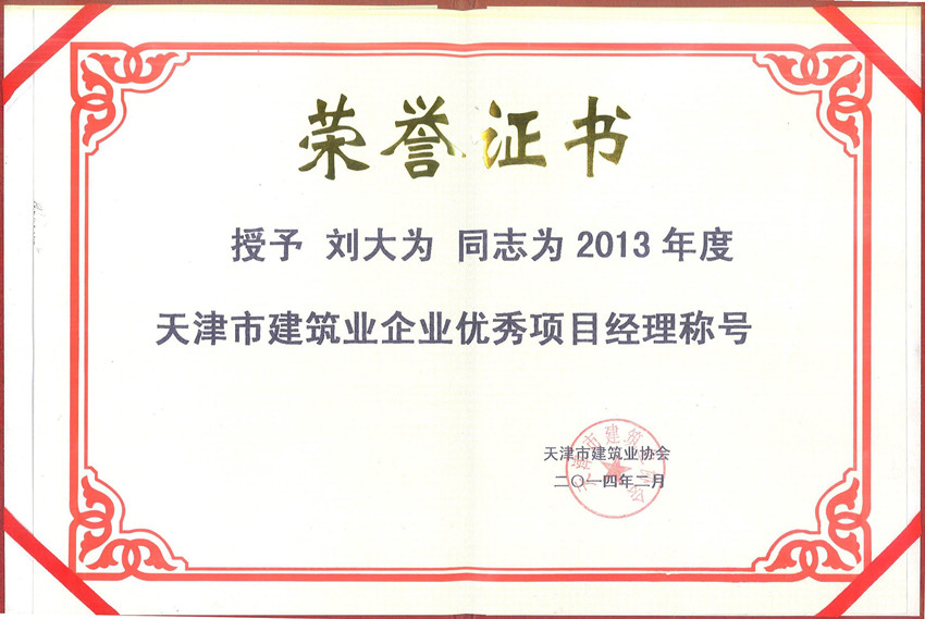 劉大為榮獲2013年度天津市建筑業(yè)企業(yè)優(yōu)秀項目經(jīng)理稱號