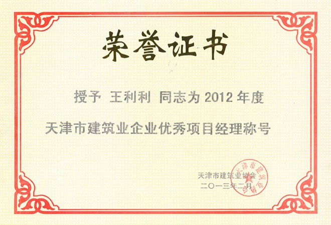 王利利榮獲2012年度天津市建筑業(yè)企業(yè)優(yōu)秀項目經(jīng)理稱號
