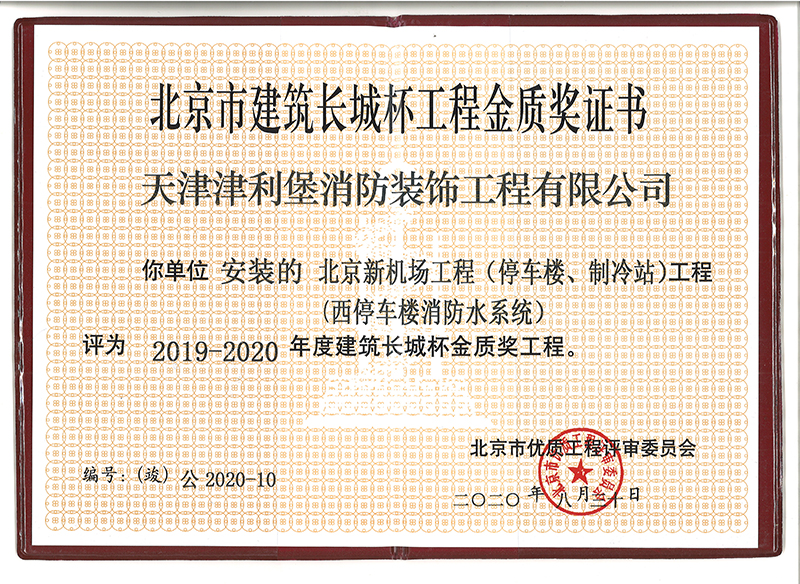 北京新機(jī)場工程(停車樓、制冷站)工程(西停車樓消防水系統(tǒng))項(xiàng)目榮獲“2019-2020年度北京市建筑長城杯工程金質(zhì)獎(jiǎng)”榮譽(yù)稱號(hào)